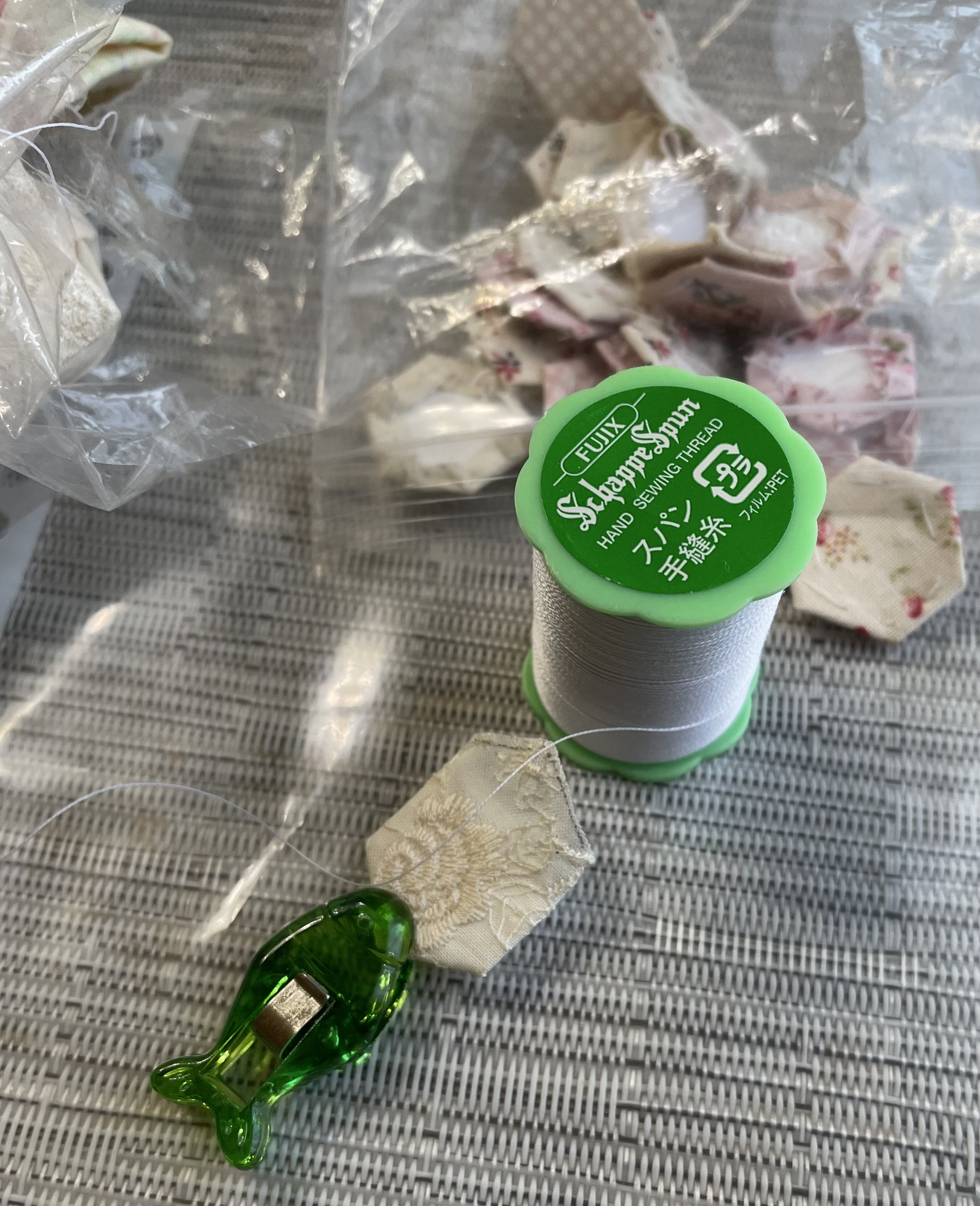 今 制作中のものの一つに、ポーチがあります。5角形ピースをひたすら作り続けています。